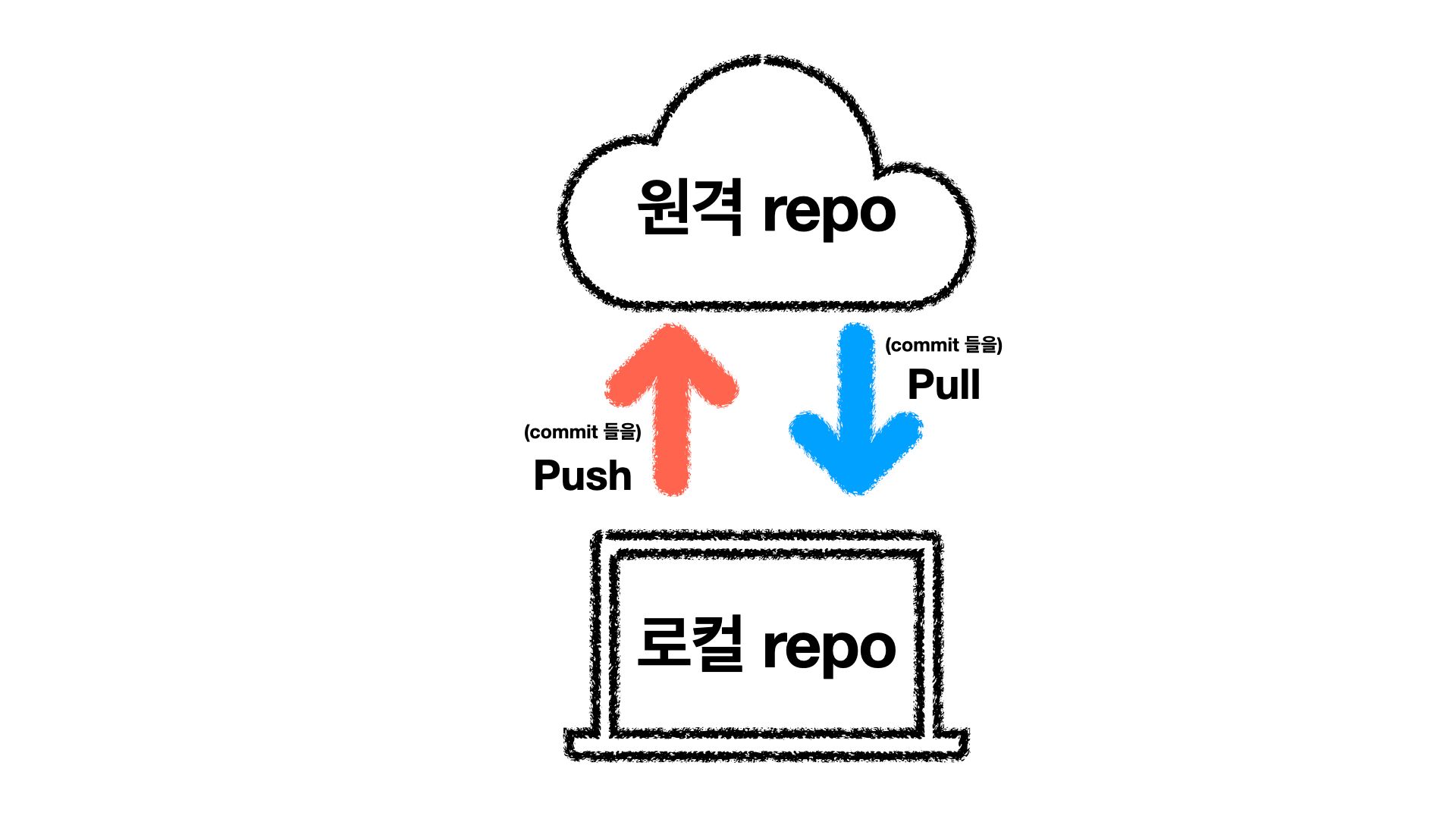 그렇기에 수동으로 로컬에서 원격으로 원격에서 로컬로 commit 하는데 이것을 각각 push(푸시)와 pull(풀)이라고 한다.