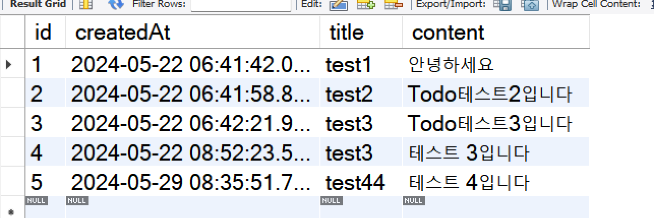 코드 부분은 끝났고 mysql에 대강 todolist 몇개를 강제로 insert해서 띄워보자