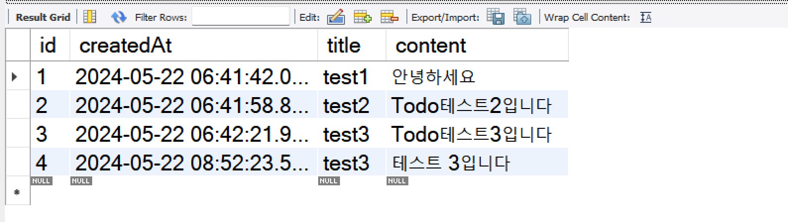 MySQL Workbench에 들어가서 입력 시키고 db를 확인해보니 잘 들어간 걸 확인할 수 있다