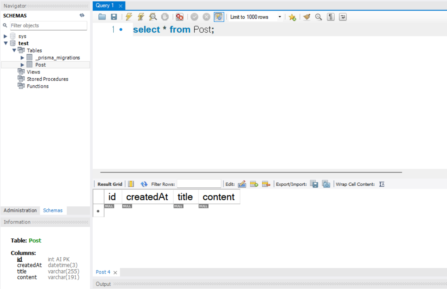 이전 글에서 docker를 이용해 mysql을 띄웠고 이후 workbench를 이용해 데이터 베이스에 쉽게 접속할 수 있도록 만들었다.그럼 이제 이를 실제로 코드상에서 사용해보려 하는데 Next.js와 Prisma를 이용해서 만들어보려고 한다.이를 통해 prisma의 사용법을 간단하게 보고 특히 Next.js의 Server action을 잘 익혀볼 수 있을 것 같다.프로젝트 설정npx create-next-app@latest 를 통해 간단한 next-app을 만든다. 이름은 sql_test로 만들었다.성공적으로 sql_test가 설치 되었다면 추가적으로 prisma를 설치하자cd sql_testnpm i prisma --save-devnpx prisma init --datasource-provider m..